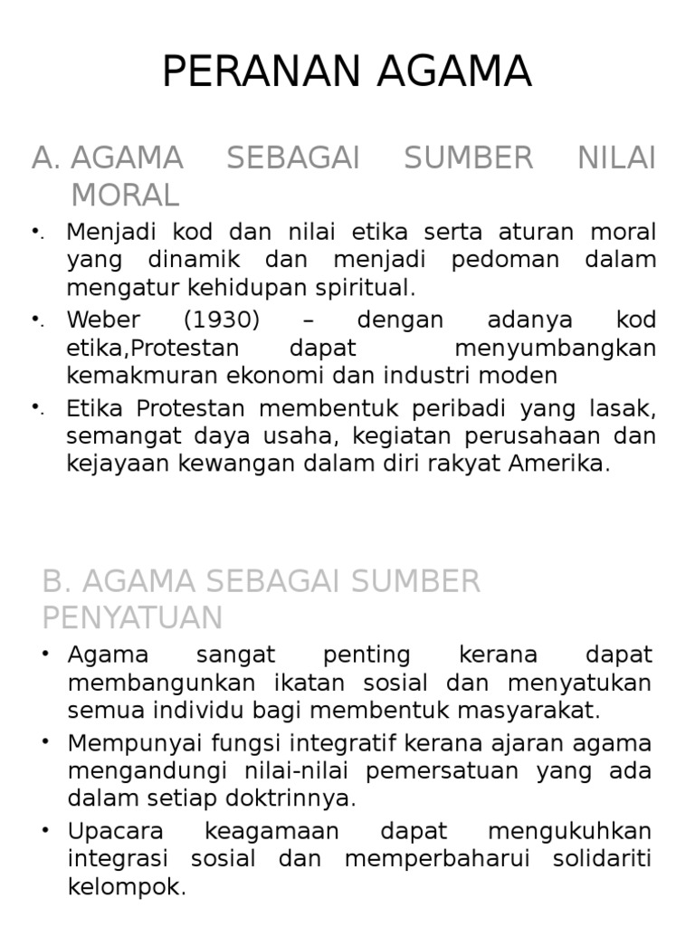 Mampu berperan dalam sebuah peranan sosial karena mengandung. Selain itu agama memainkan peranan yang penting dalam membentuk pandangan dunia dalam kehidupan manusia serta mendatangkan ketengan dan keamanan di kalangan penduduk dunia sehinggakan agama itu dijadikan sebagai sumber kekuatan dan mekanisme yang berpengaruh. Peranan dialog peradaban di dalam wacana tamadun malaysia. * perpaduan rakyat malaysia adalah satu perkara penting yang perlu diberi perhatian dalam proses pembangunan negara. Kepelbagaian agama di malaysia :